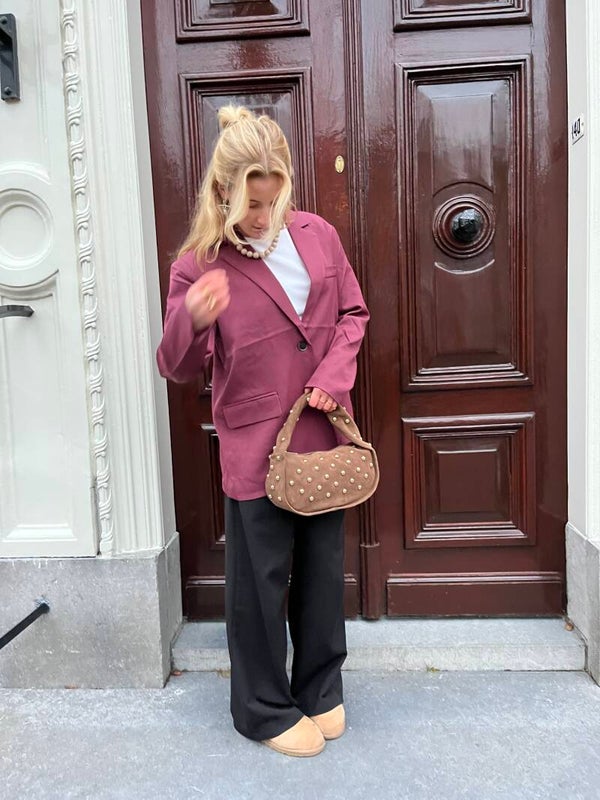 Combineer deze blazer met een blouse en pantalon voor een verfijnde zakelijke look, of draag ‘m over een top met jeans voor een stijlvolle avondoutfit. Voeg een vleugje luxe toe aan je garderobe met deze bordeaux blazer met een twist!
